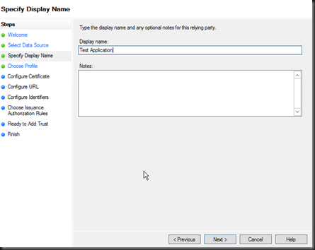 You will now be able to login to your application, although at this point no claims have been configured so it is rather useless. The next dialog provides you the ability to configure and forward claims to the relying application. Without any claims your application will see no authentication properties. Below I configure the Name claim to be sent to the ASP.NET application, this is then presented in the ASP.NET Thread.CurrentPrincipal.Name property.